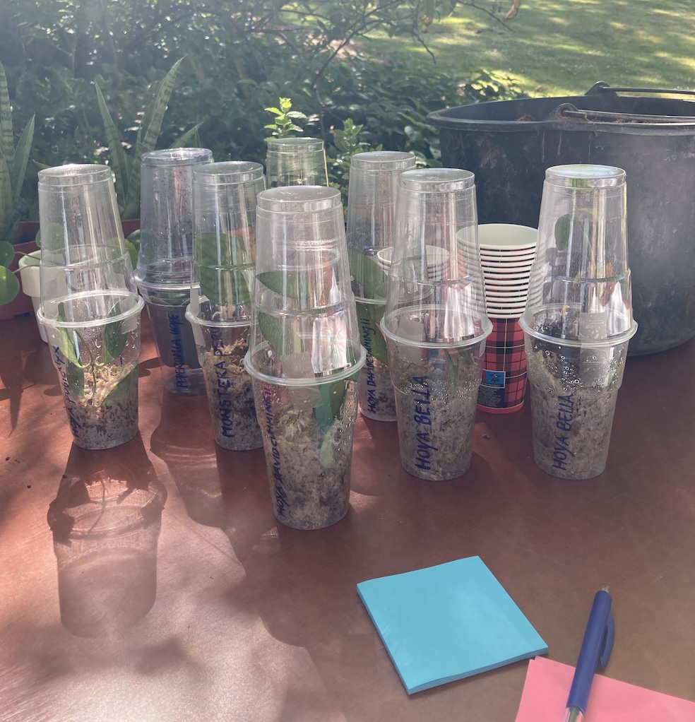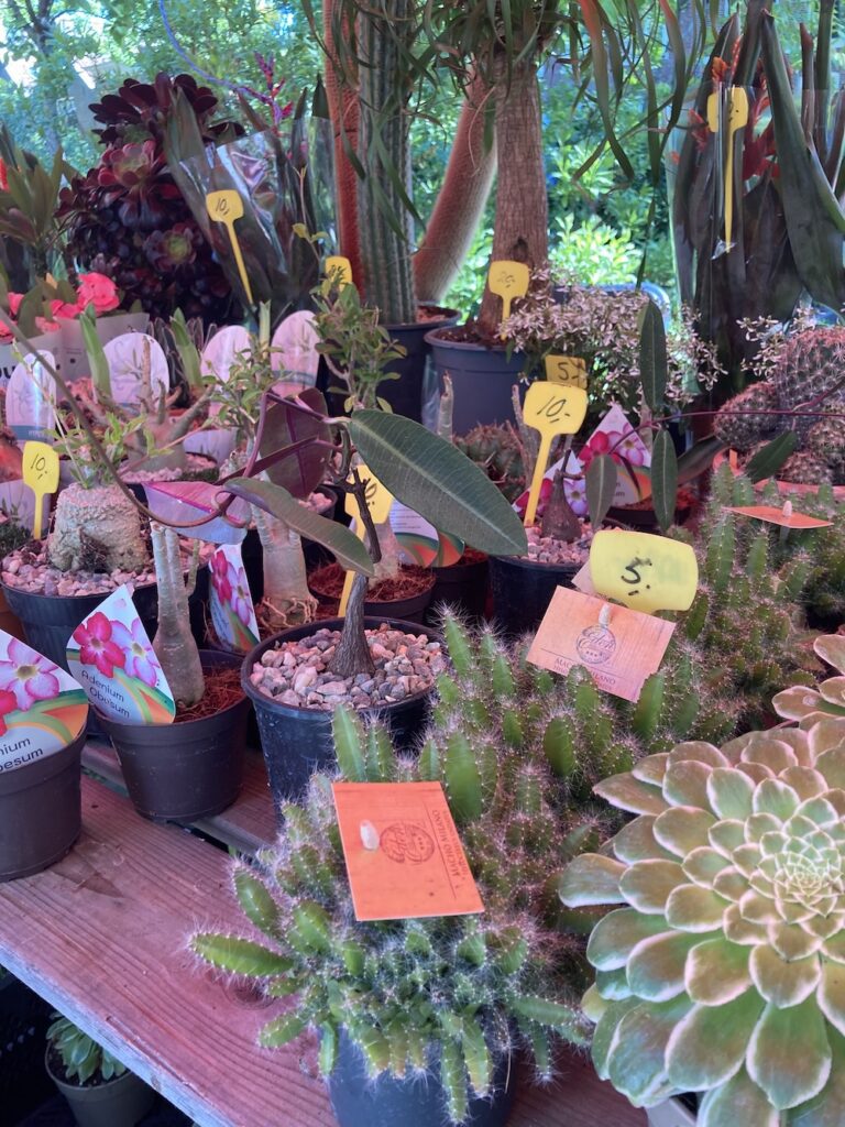 Eén van beste plekken op de plantenmarkt is de stekjesruil. Achterin de tuin staan een paar tafels, met bekers, post-it’s en begeleiders van de hortus. Je mag je stekjes neerzetten voor iedereen om te pakken, maar wat je ook kan doen is een tafel uitkiezen en wachten tot iemand ruilen wil. Het is leuk om regelmatig langs de stekjeshoek te lopen, omdat gedurende de hele dag er nieuwe stekjes bijkomen.