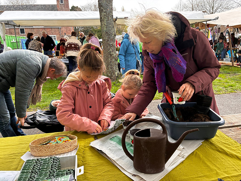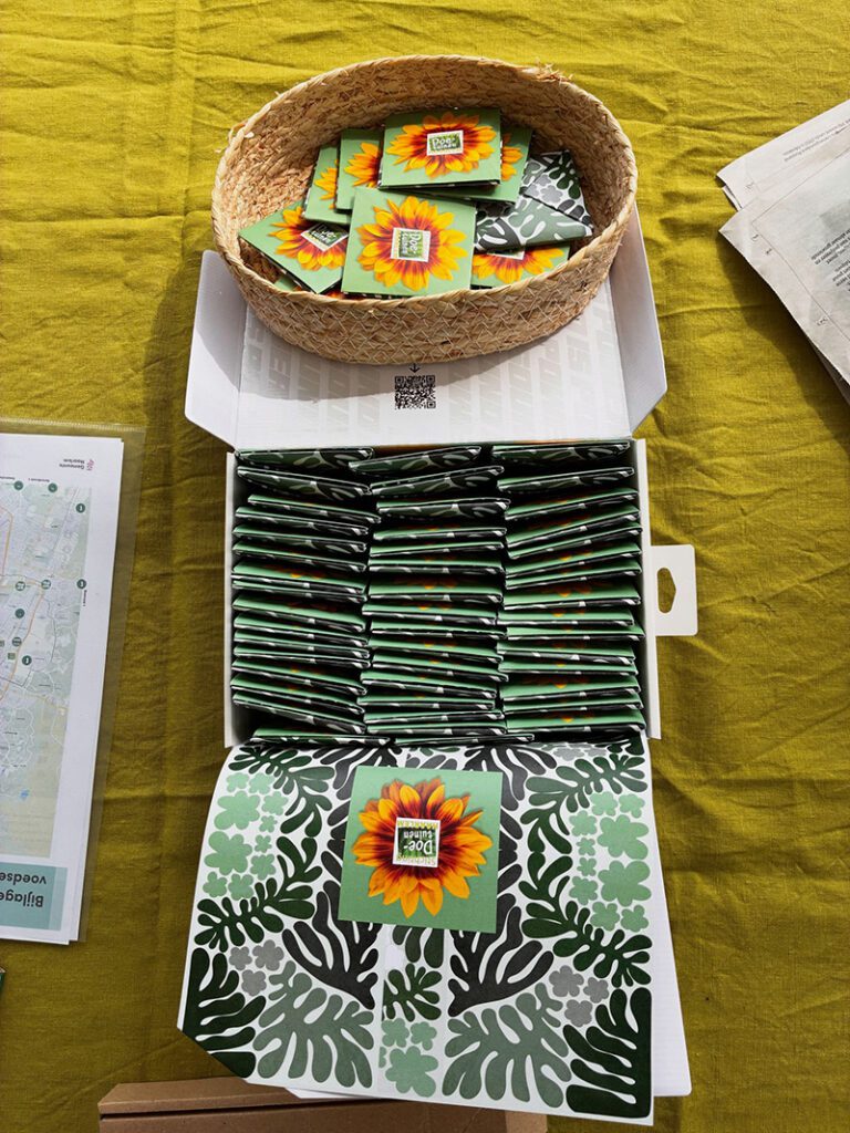Vooral kinderen konden bij ons zelf aan de slag: zij mochten een zonnebloemzaadje planten om mee naar huis te nemen. Daarnaast hebben we onze bekende zaadzakjes met zonnebloemzaadjes uitgedeeld. De zonnebloem is niet voor niets ons symbool: deze plant trekt bijen en andere bestuivers aan, biedt na de bloei voedsel voor vogels en is later ook weer waardevol voor insecten. Een echte alleskunner voor de natuur dus!